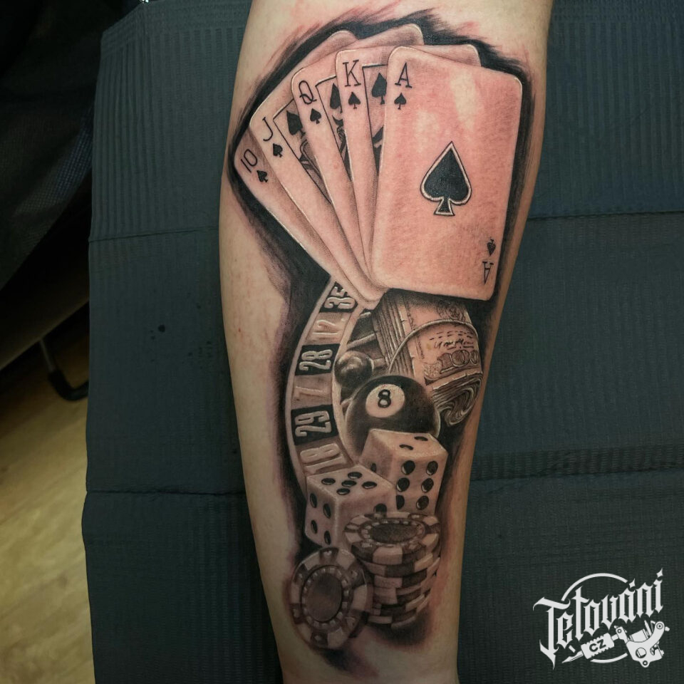 Tetování hrací karty, kostky, poker na holeň