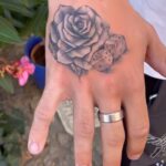 Tetování hrací kostky a růže na hřbet ruky