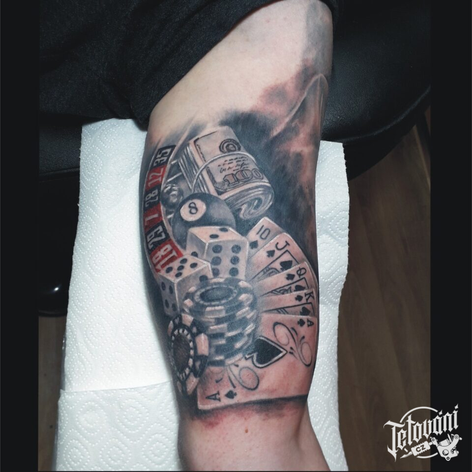 Tetování hrací kostky, karty na paži