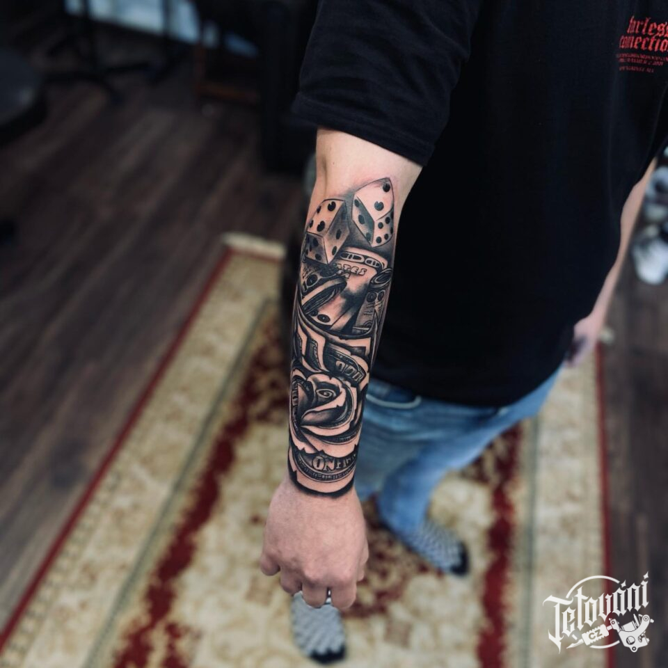 Tetování hrací kostky, peníze, růže na předloktí