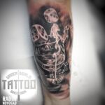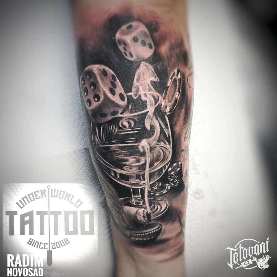 Tetování hrací kostky, sklenička, cigareta na předloktí