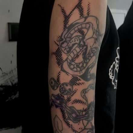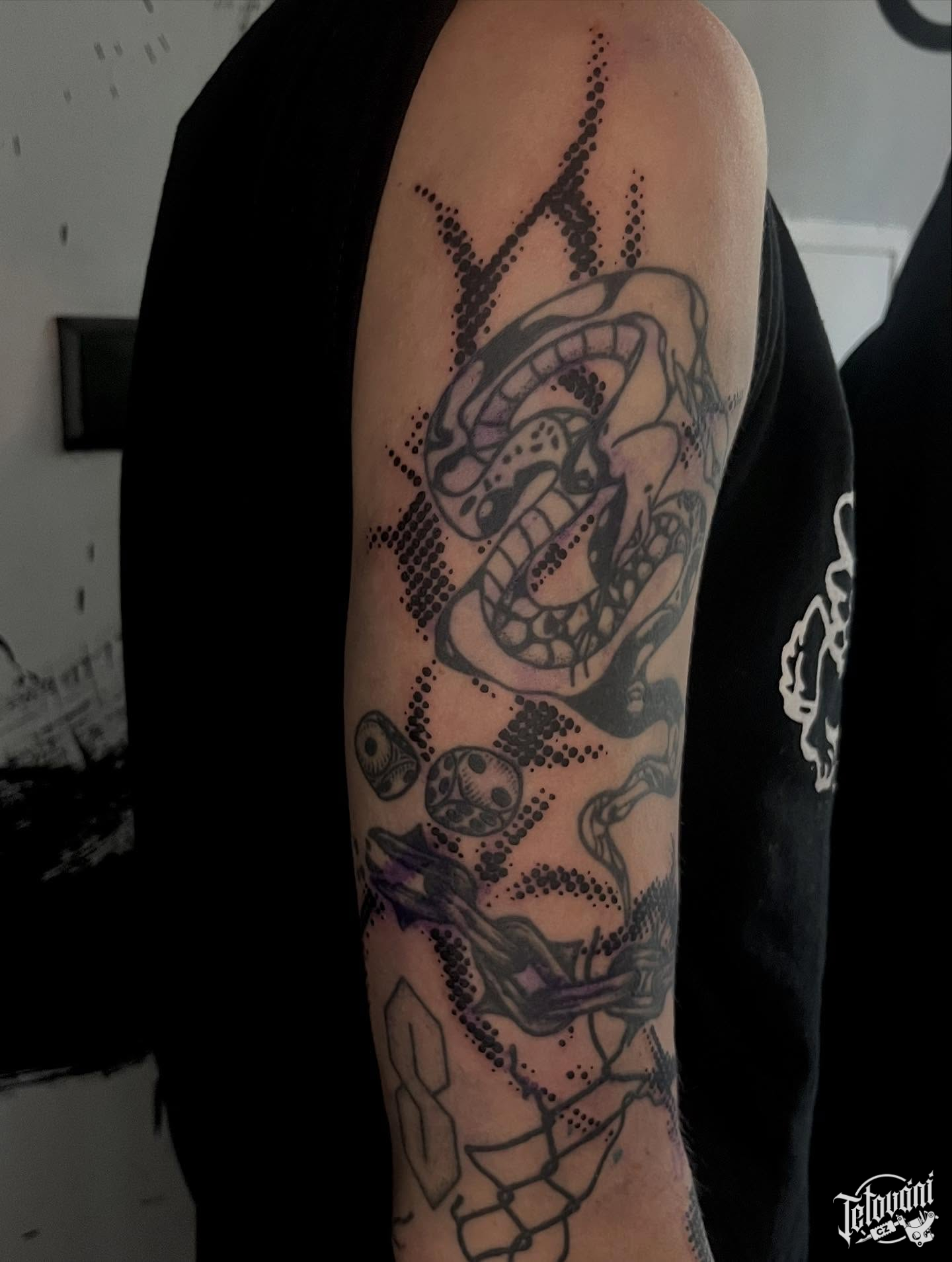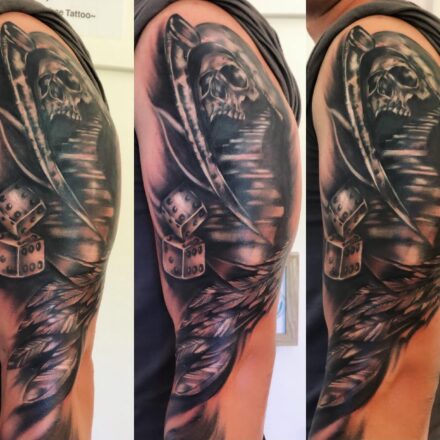 Tetování hrací kostky, zbraň, nápis na lýtko