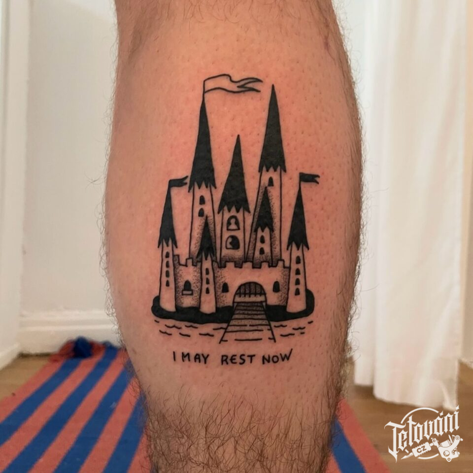 Tetování hrad a nápis na lýtku