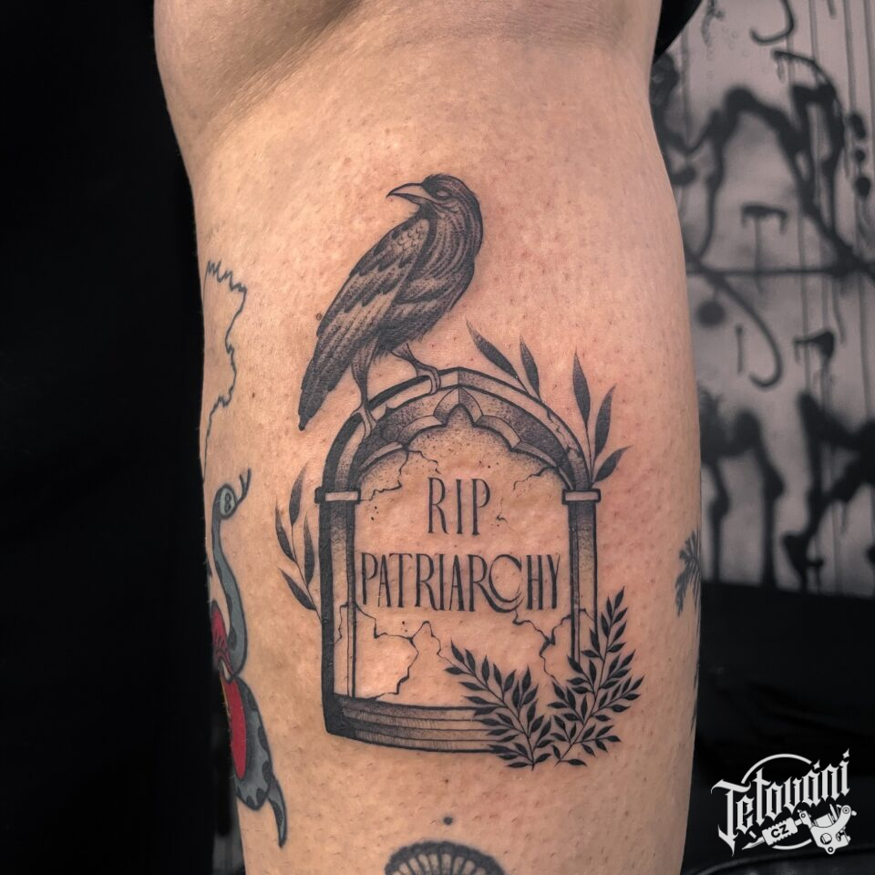 Tetování hrob, smrt, zvíře havran na lýtko