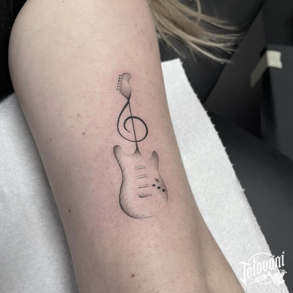 Tetování hudba, houslový klíč, kytara na předloktí