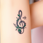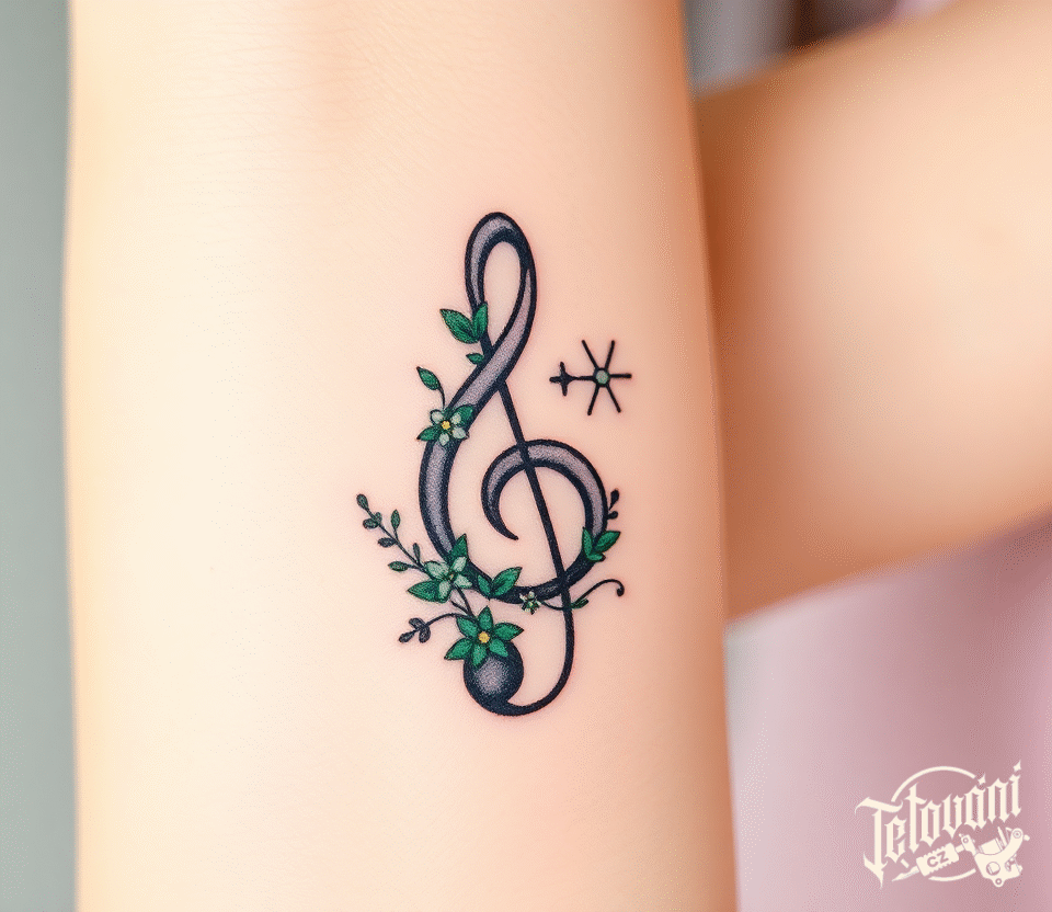 Tetování hudba, houslový klíč s květinkami na předloktí