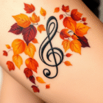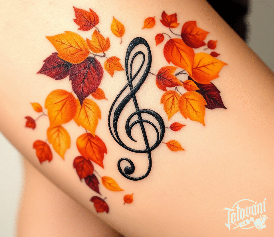 Tetování hudba, houslový klíč s podzimním listím na boku stehna