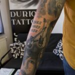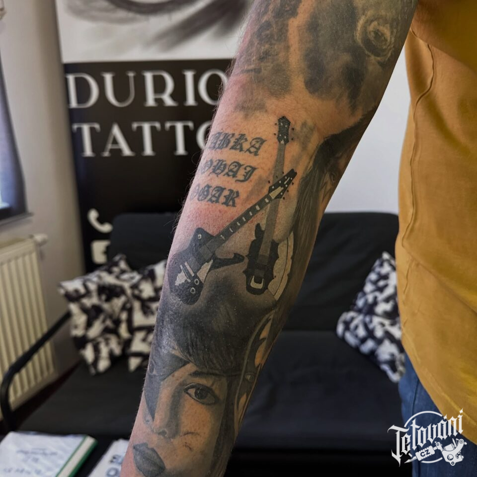 Tetování hudba, kytary, osobnosti, portrét na předloktí