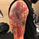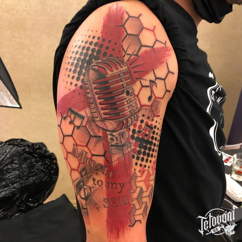 Tetování hudba, mikrofon, nápisy na rameno