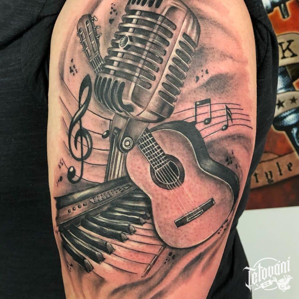 Tetování hudba, noty, kytara na rameno