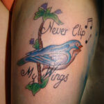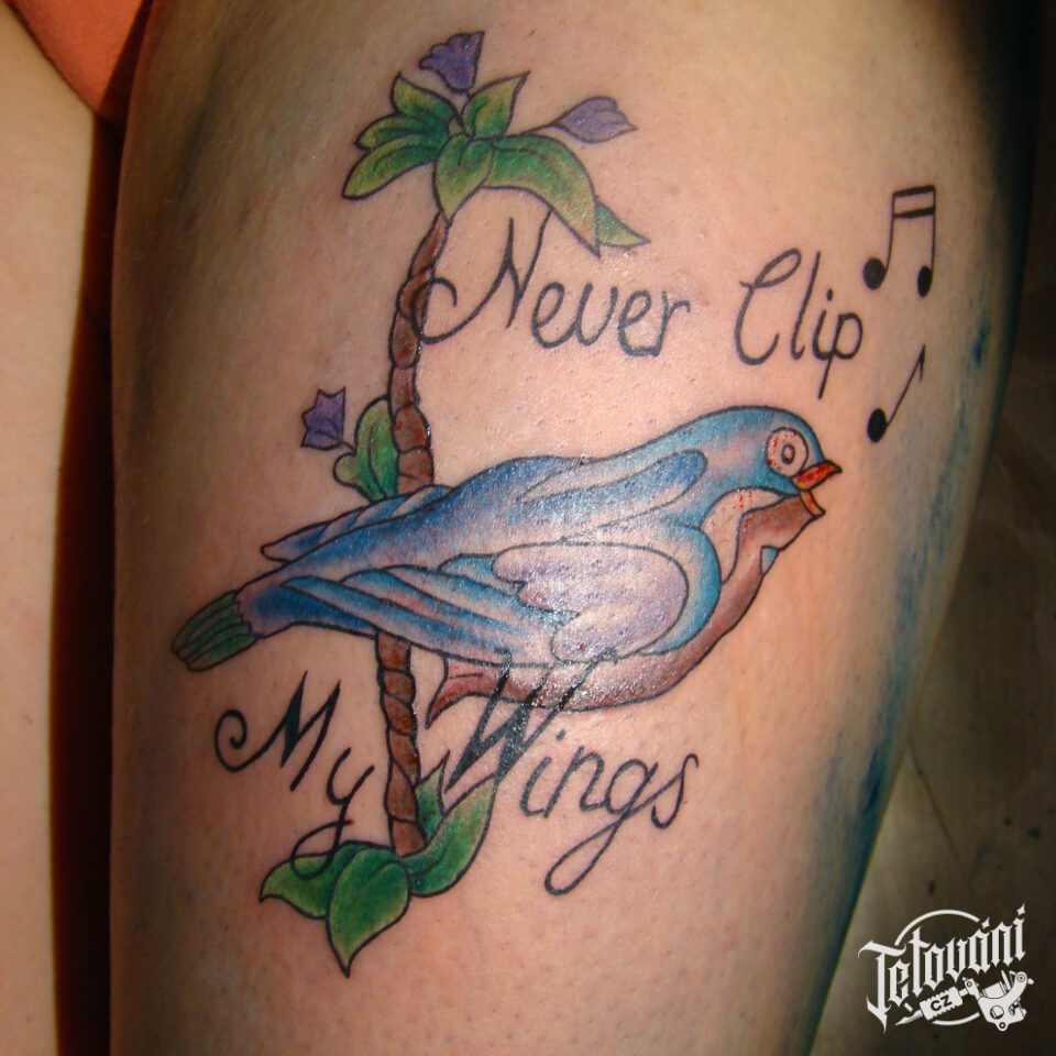 Tetování hudba, noty, zvíře, pták a nápisy na stehně