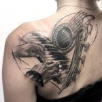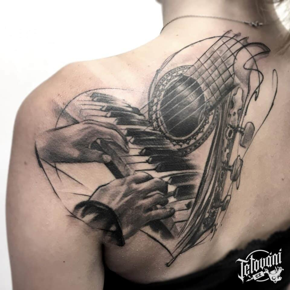 Tetování ruce, hudba, piano, kytara na lopatku