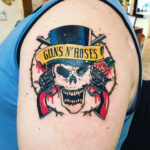 Tetování hudba, skupina Guns N‘ Roses, logo s lebkou a pistolemi na rameni