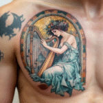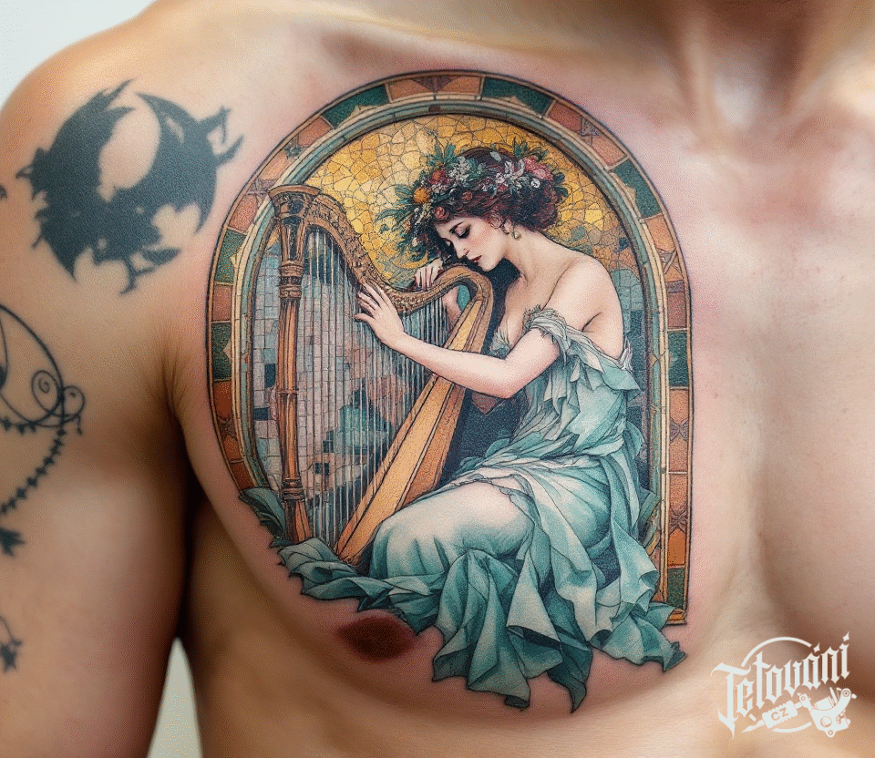 Tetování hudba, žena s harfou od Alfonse Muchy na hrudi