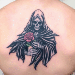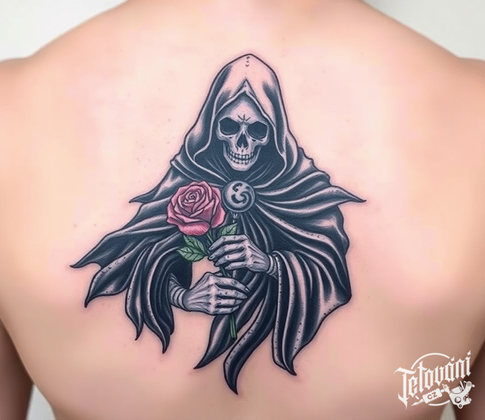 Tetování hudba, metal, kostlivec s růží na záda