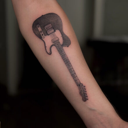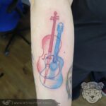 Tetování hudební nástroje, kytara a violoncello na předloktí