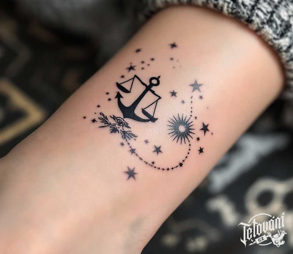 Tetování hvězda, znamení zvěrokruhu váhy se souhvězdím na předloktí