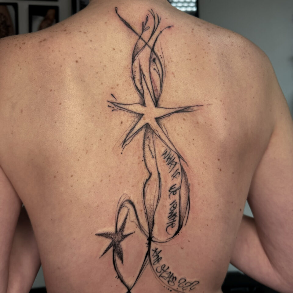 Tetování hvězdy, čáry, nápisy na zádech