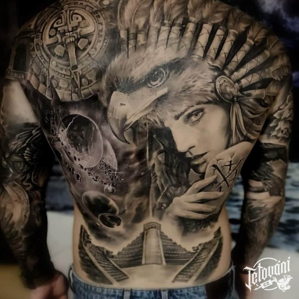 Tetování indiáni, zvířata, orel, planety a znaky a symboly na zádech