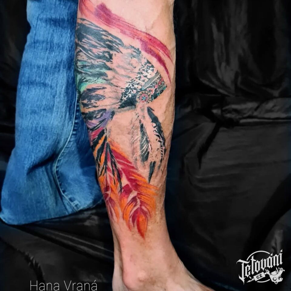 Tetování indiánská čelenka na předloktí