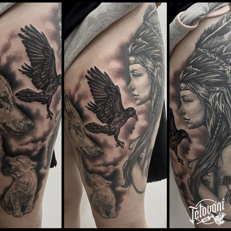 Tetování indiánská žena zvíře havran a vlk na stehno