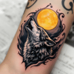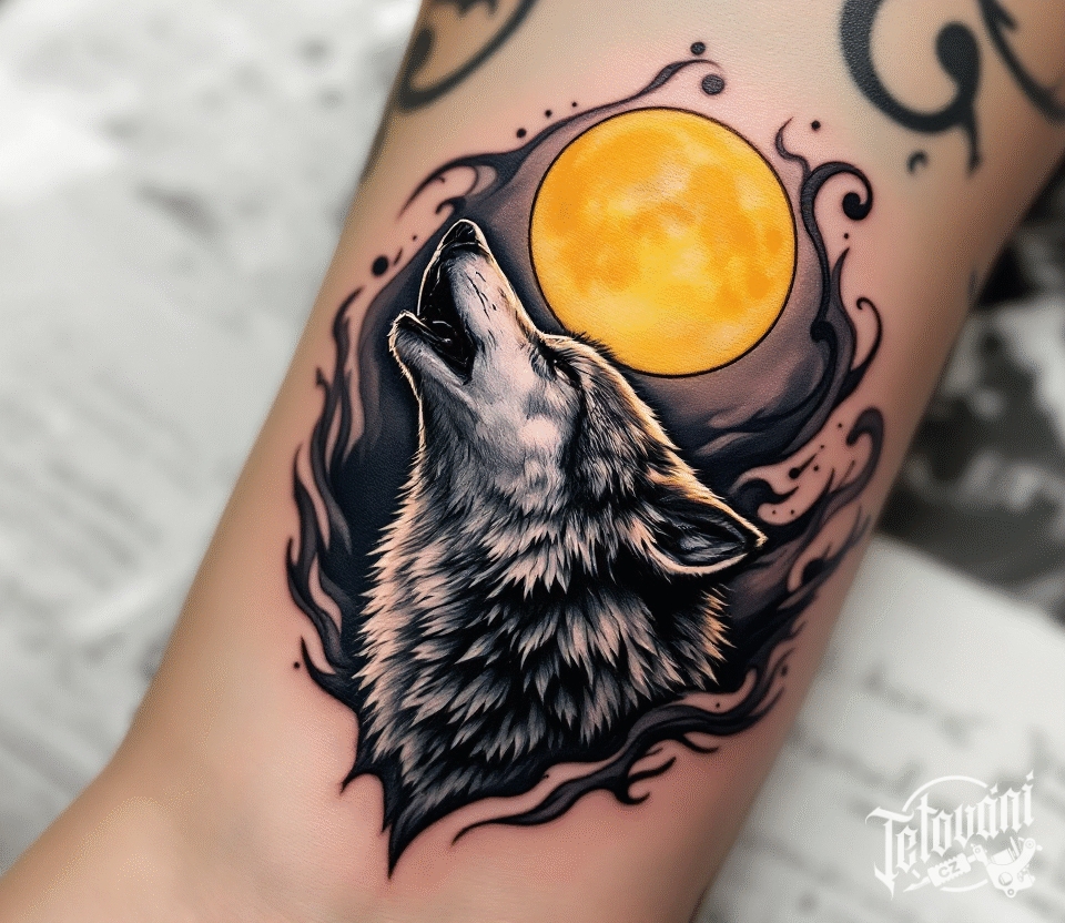 Tetování indiánské symboly, hlava vlka a Měsíc na zápěstí