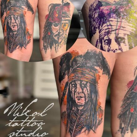 Tetování Jack Sparrow, západ slunce a moře na stehně