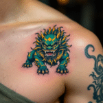 Tetování japonské symboly, drak pod klíční kostí