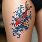 Tetování japonské symboly, koi kapr na stehně