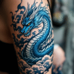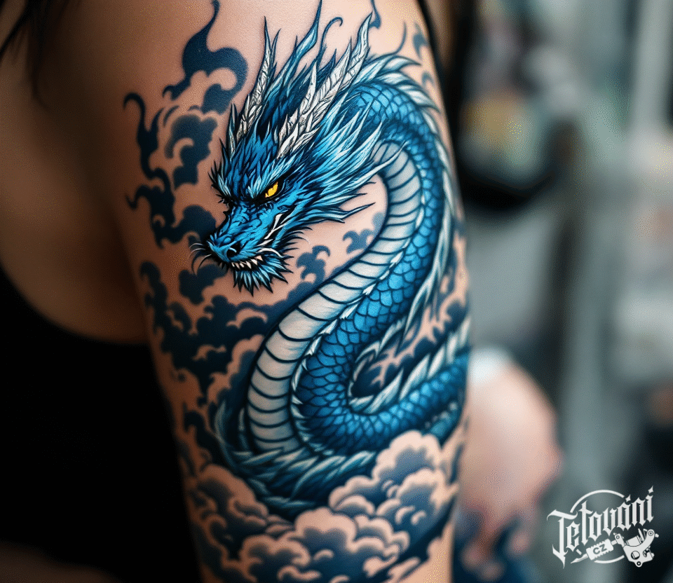 Tetování japonské symboly, mýtická bytost, modrý drak na rameni