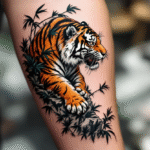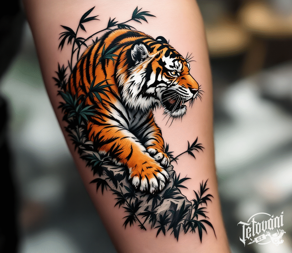 Tetování japonské symboly, zvíře, tygr na předloktí