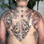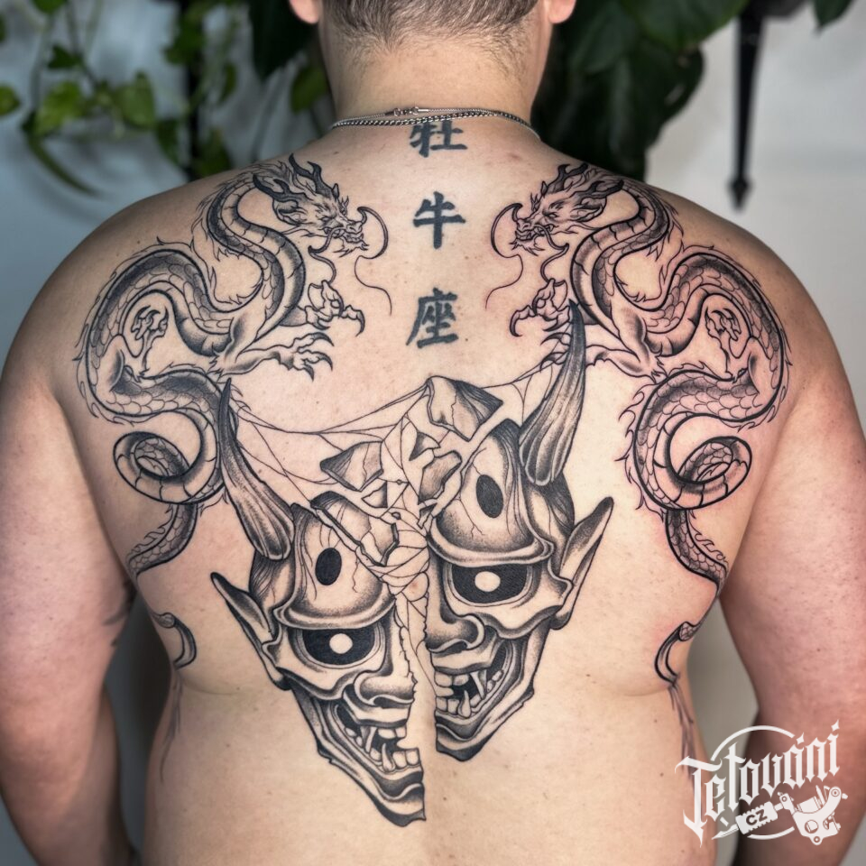 Tetování japonské znaky, masky Hannya, mýtické bytosti drak na záda
