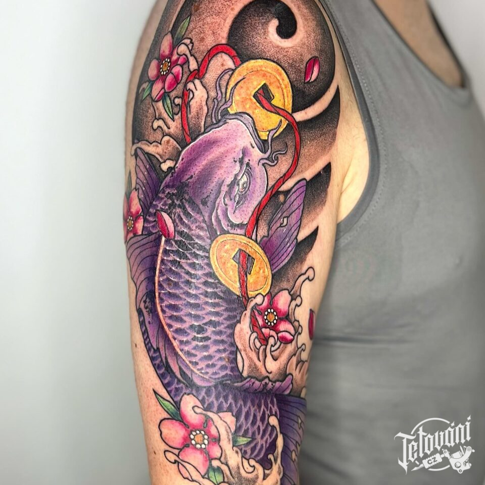 Tetování japonské znaky, zvíře, ryba, kapr na rameni