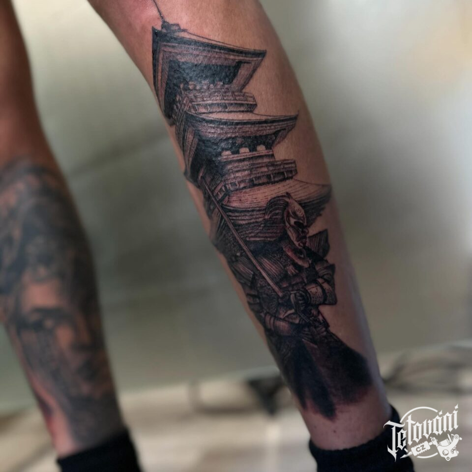 Tetování japonský samuraj, pagoda na lýtku