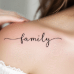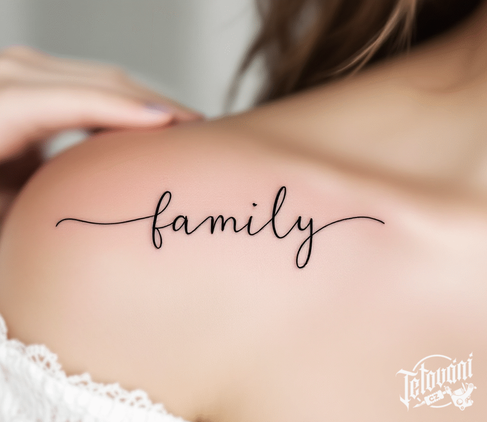 Tetování jemný nápis family pod klíční kostí