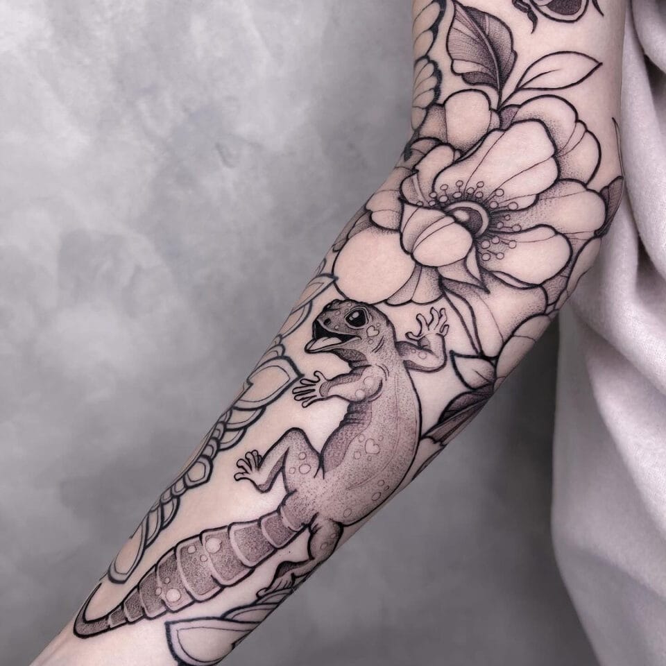 Tetování ještěrka s květinami rukáv