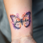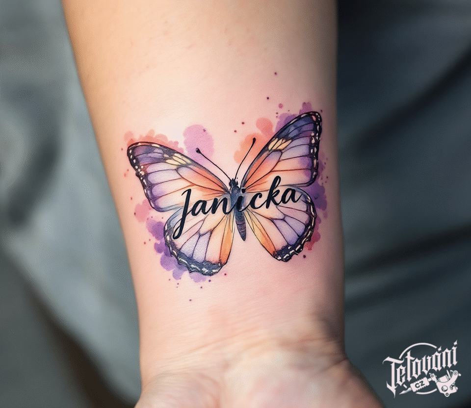 Tetování jména dětí a zvíře, nápis Janička s motýlem na předloktí