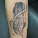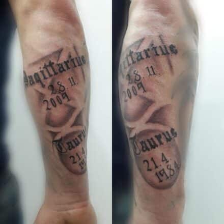 Tetování jména dětí, datumy, pírko s nápisy na předloktí