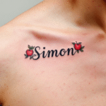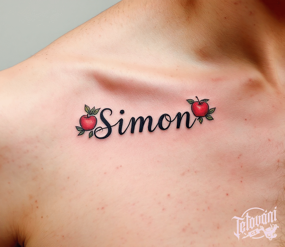 Tetování jména dětí, nápis Simon a jablíčka pod klíční kostí