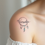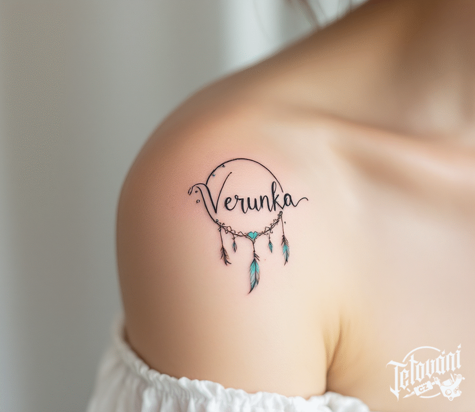 Tetování jména dětí, nápis Veruna a lapač snů na rameni