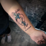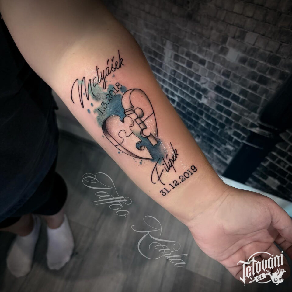 Tetování jména dětí s datumem narození a srdce z puzzlů na předloktí