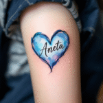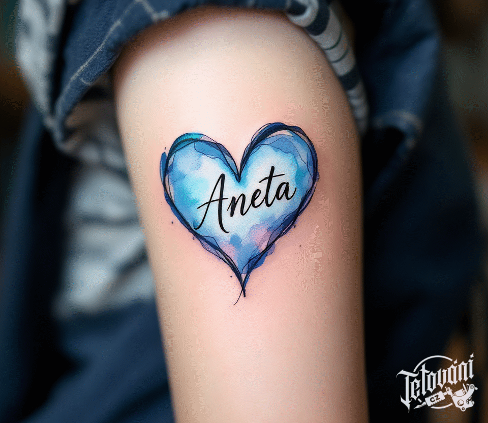 Tetování jména dětí v srdci, nápis Aneta na předloktí
