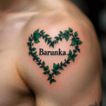 Tetování jména dětí v srdci, nápis Barunka na rameni