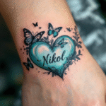 Tetování jména dětí v srdci, nápis, srdce se jménem Nikol na zápěstí