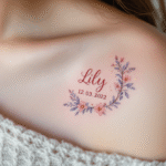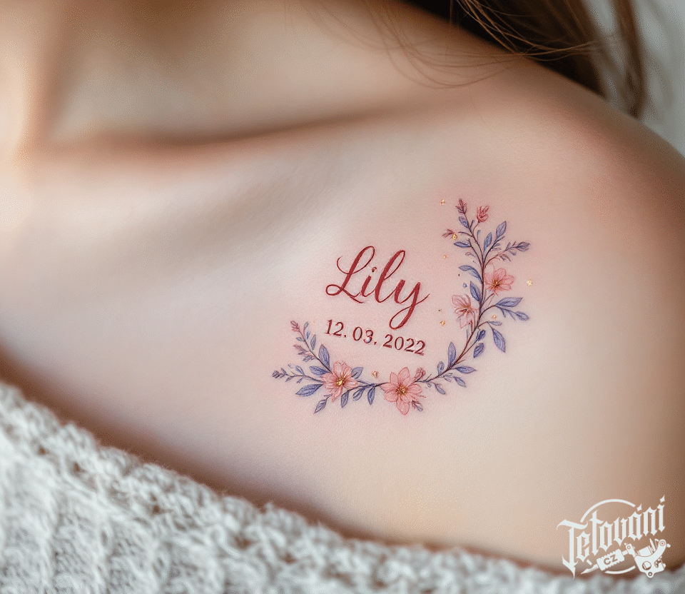 Tetování jméno a datum narození dítěte pod klíční kostí