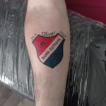 Tetování jméno a datum narození dítěte s vlajkou fotbalového klubu na předloktí