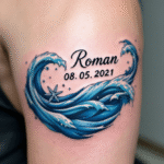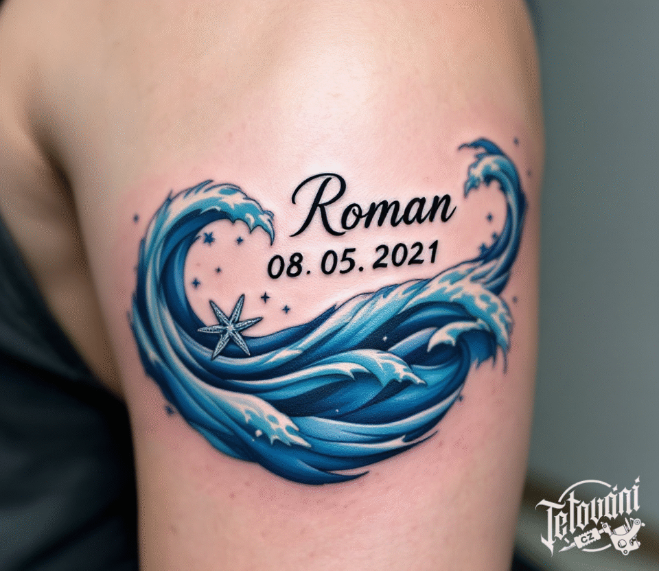 Tetování jméno a datum narození dítěte s vlnami moře na rameni