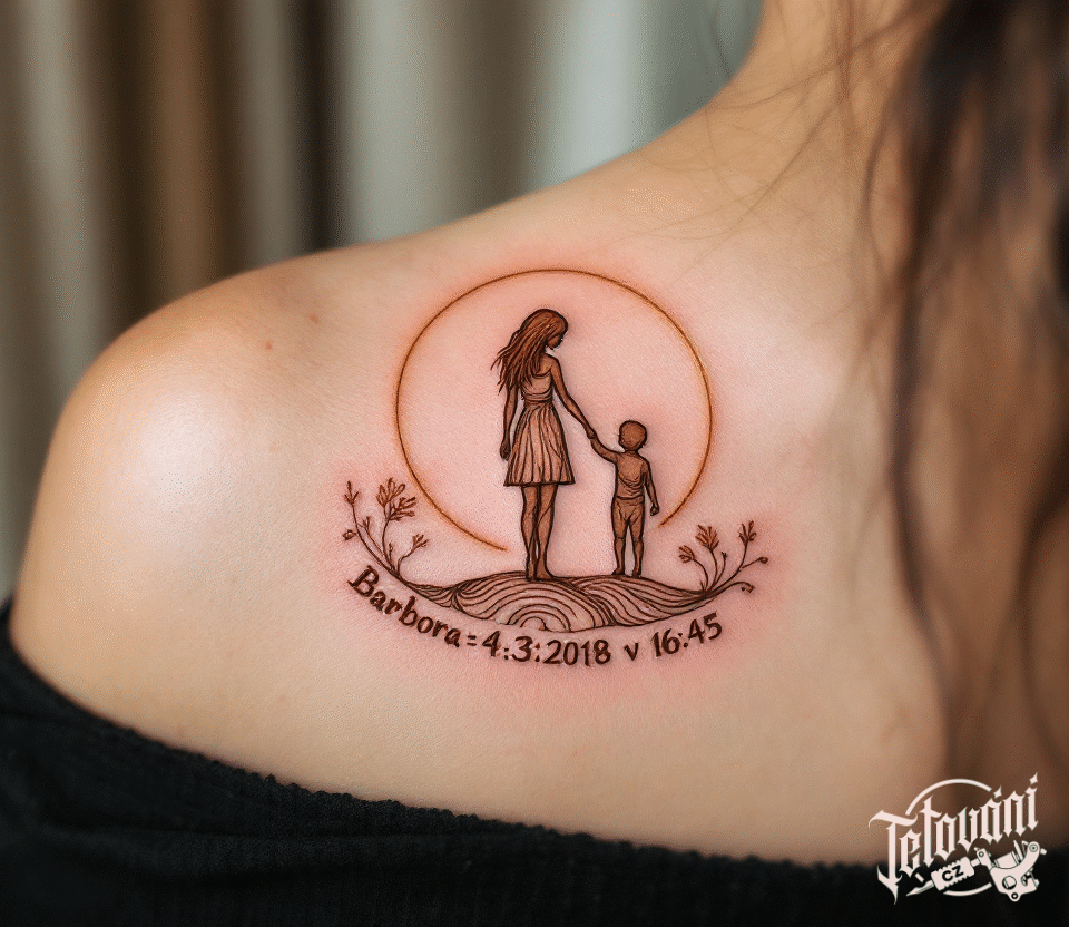 Tetování jméno dítěte a jeho čas a datum narození na lopatku