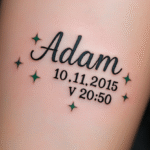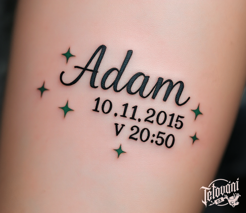 Tetování jméno dítěte Adam, datum a čas narození na rameno