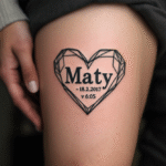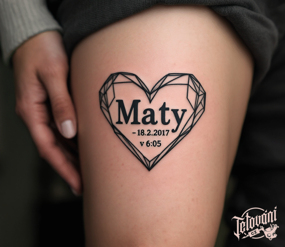 Tetování jméno dítěte v srdci, hodiny a narození dítěte na stehno